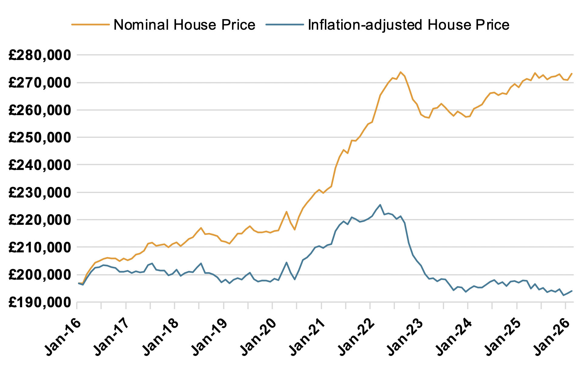 From January 2016 to January 2026, did house prices grow faster than inflation? The answer is in the graph below.
